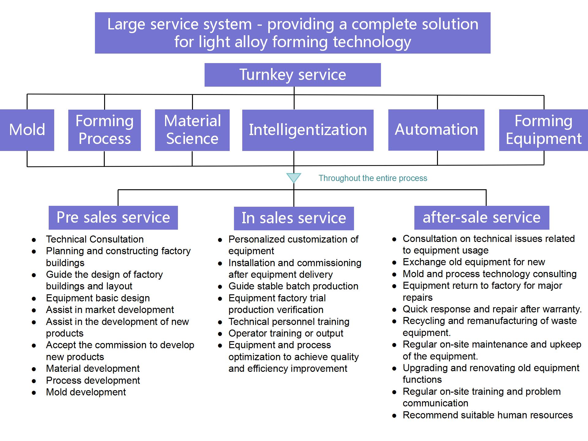 The company adheres to the concept of "big service" and provides customers with a complete set of solutions for precision forming of light alloys. The solutions cover comprehensive technical services such as forming equipment, materials, processes, molds, automation, and intelligence. The service process runs through all aspects of pre-sales, sales, and after-sales, and the comprehensive and full process turnkey service concept is highly favored by customers.