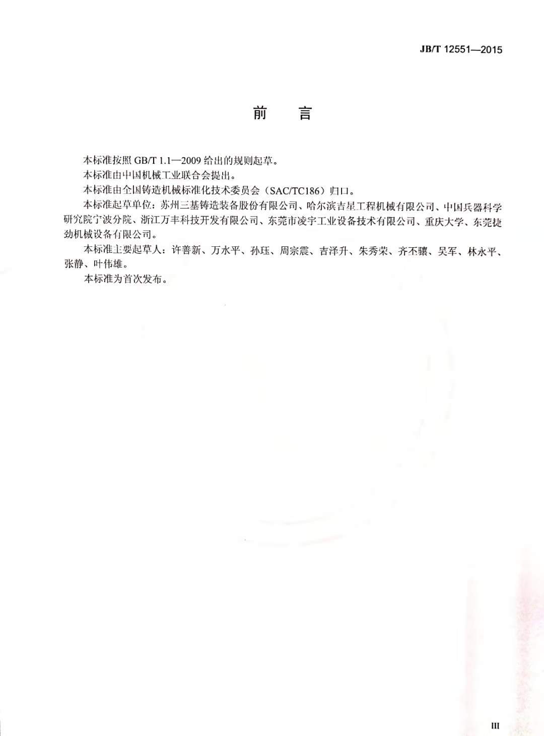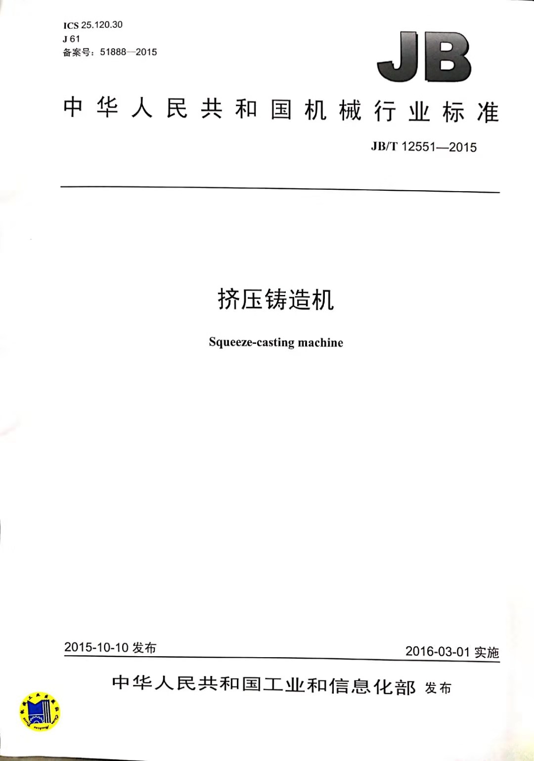 由蘇州三基鑄造裝備股份有限公司主持,哈爾濱吉星工程機械有限公司、中國兵器科學研究院寧波分院等單位參與制定的《擠壓鑄造機》行業(yè)標準于2015年10月10日發(fā)布,并于2016年3月1日起正式實施。該標準為國內(nèi)在擠壓鑄造領域制定的首個標準。