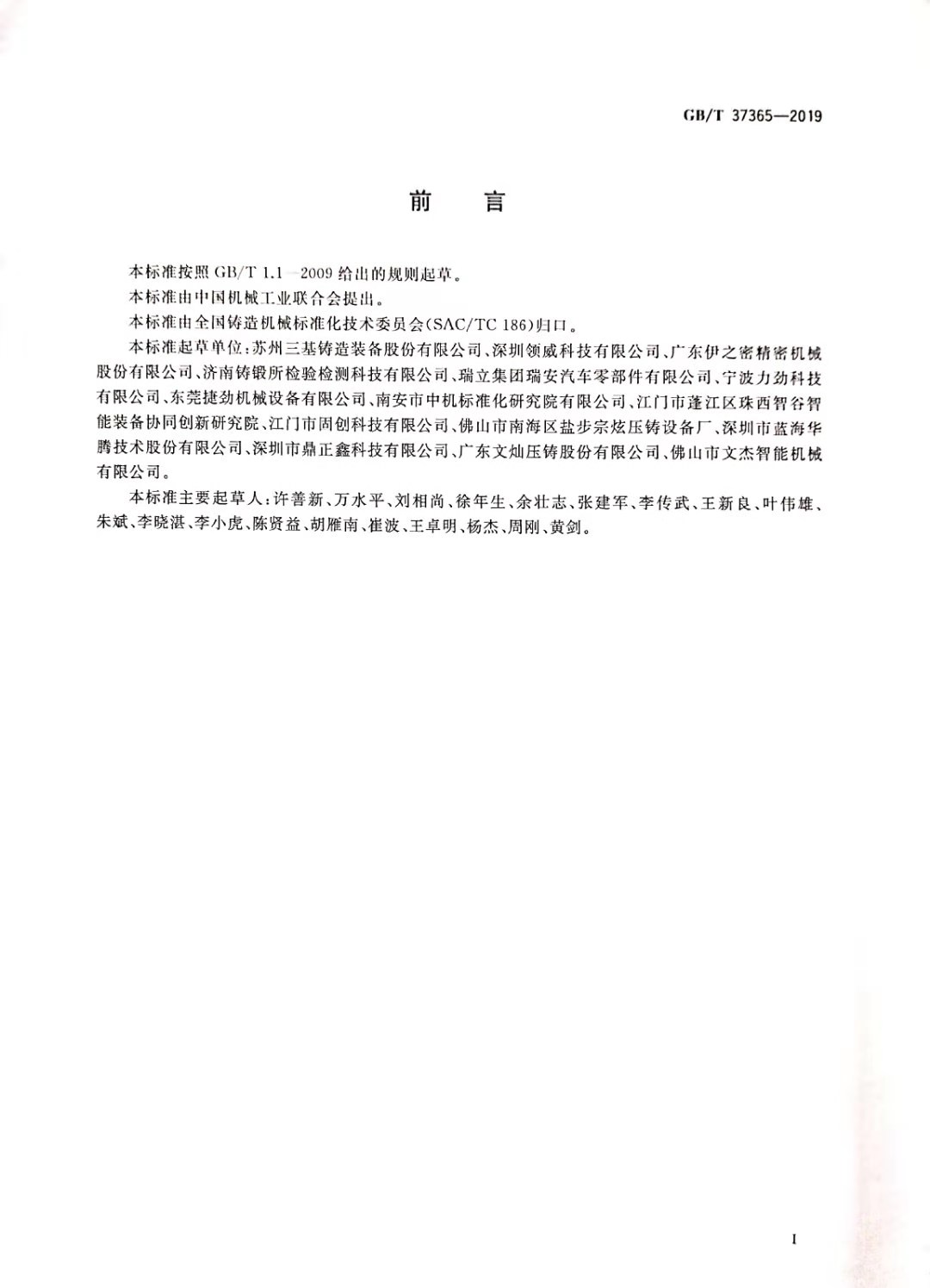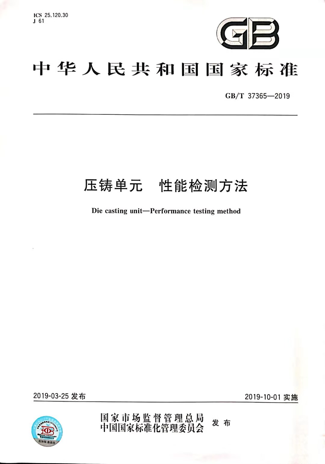 由公司建議立項(xiàng)并主持制定的國家標(biāo)準(zhǔn)《壓鑄單元-性能檢測(cè)方法》于2019年3月25日正式發(fā)布,于2019年10月日起正式實(shí)施。該標(biāo)準(zhǔn)在壓鑄機(jī)標(biāo)準(zhǔn)體系中是一個(gè)非常核心的標(biāo)準(zhǔn),標(biāo)準(zhǔn)的執(zhí)行將對(duì)國內(nèi)壓鑄機(jī)的研發(fā)制造水平提升有著重要的促進(jìn)作用。