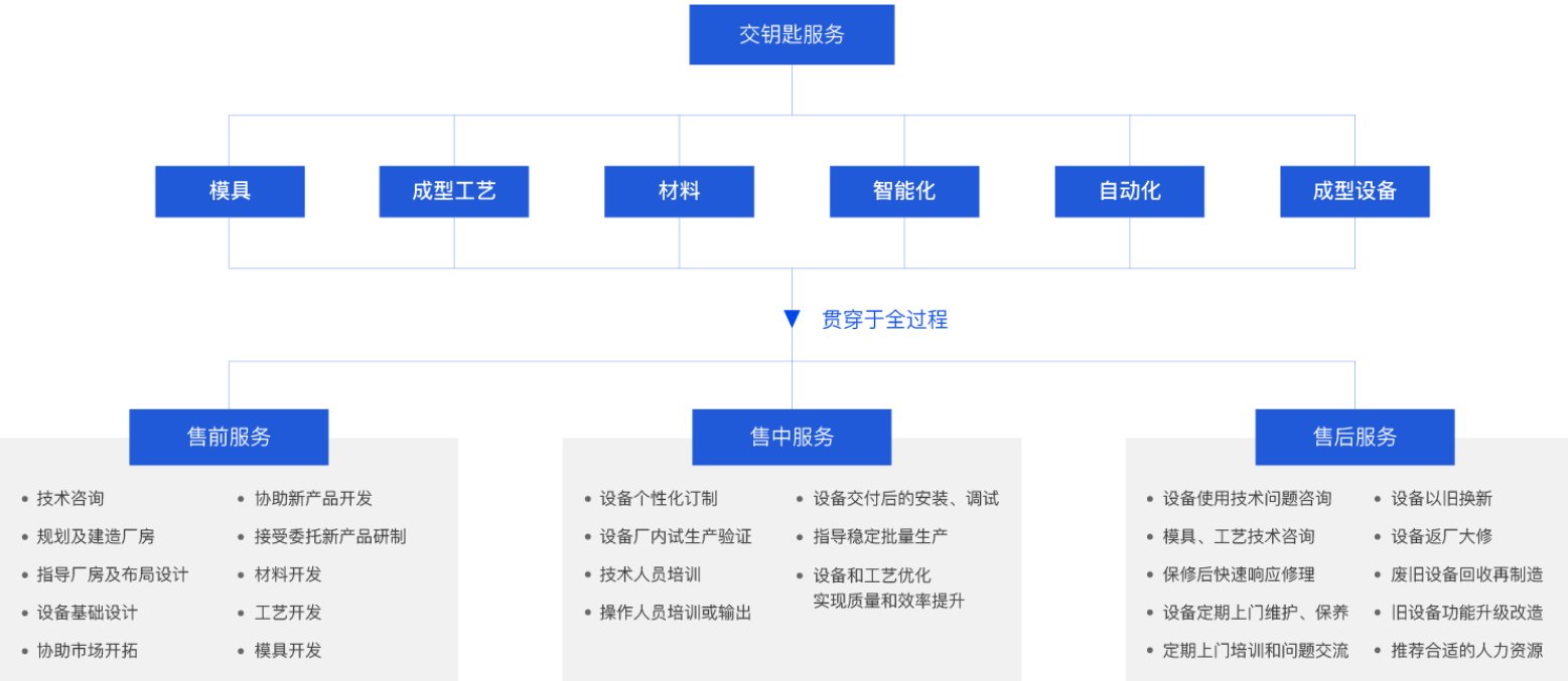 近年來,三基在掌握壓力鑄造裝備研制的核心技術并不斷豐富工藝應用案例的同時,基于同客戶的實際合作經(jīng)歷、從客戶角度出發(fā),逐步打造出了以為客戶增值為產(chǎn)品定位的三基‘服務型產(chǎn)品’。我們秉承“工業(yè)大服務”理念,依托三基省級工程技術研究中心及中試車間,將擠壓鑄造(液態(tài)模鍛)的工藝優(yōu)勢最大化地應用拓展,提供交鑰匙形式的(Turnkey Service)‘服務型產(chǎn)品’- 涵蓋成型裝備、原材料、工藝、模具、自動化、供應鏈、智能化等多維度。