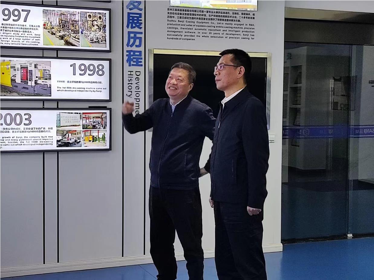 11月17日上午,中國鑄造協(xié)會張志勇常務(wù)副會長、上海辦事處楊楊主任一行蒞臨蘇州三基鑄造裝備股份有限公司考察指導(dǎo)。公司許善新董事長接待并詳細(xì)介紹了蘇州三基的發(fā)展歷程、技術(shù)發(fā)展現(xiàn)狀以及馬鞍山三基項(xiàng)目投產(chǎn)進(jìn)展情況。張會長還特別了解了三基擠壓鑄造(液態(tài)模鍛)技術(shù)和裝備相關(guān)情況。