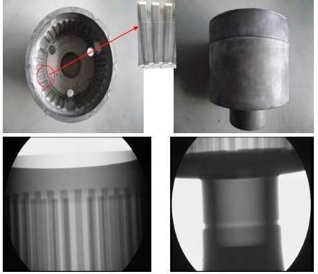研發(fā)成果:成型后的擠鑄件外觀無缺陷,內(nèi)腔及花鍵均無拉傷,通過了客戶專用齒形檢具驗(yàn)收。通過按ASTM-E-505標(biāo)準(zhǔn)采用x-ray檢測(cè)內(nèi)部質(zhì)量,鑄造缺陷小于1級(jí)。